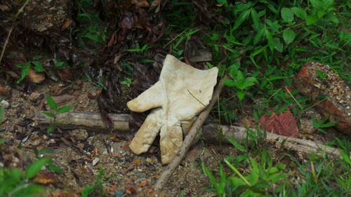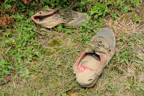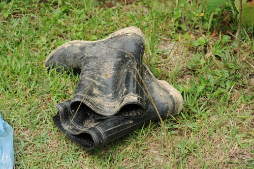 | Dụng cụ, bảo hộ lao động dính bùn đã khô còn vương lại sau vụ sạt lở. |