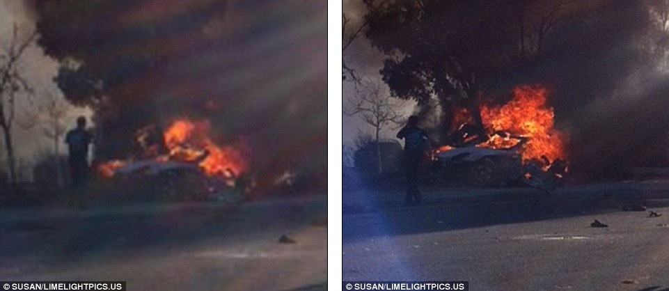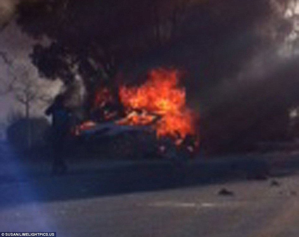 | Hình ảnh do nhân chứng chụp lại cho thấy chiếc xe ngay lập tức bị chìm trong lửa sau khi tài xế lạc tay lái đâm vào cột điện. |
