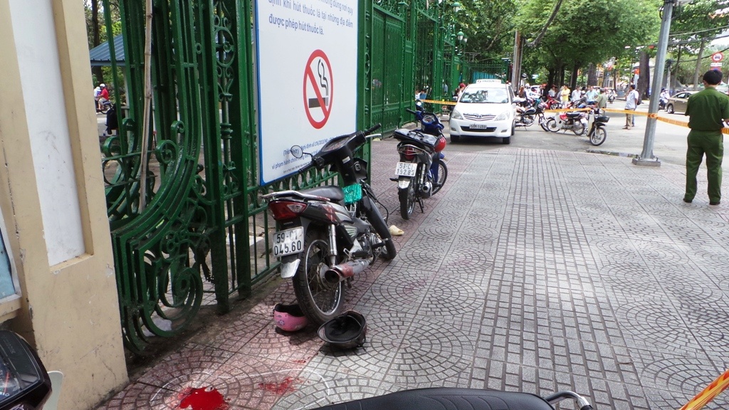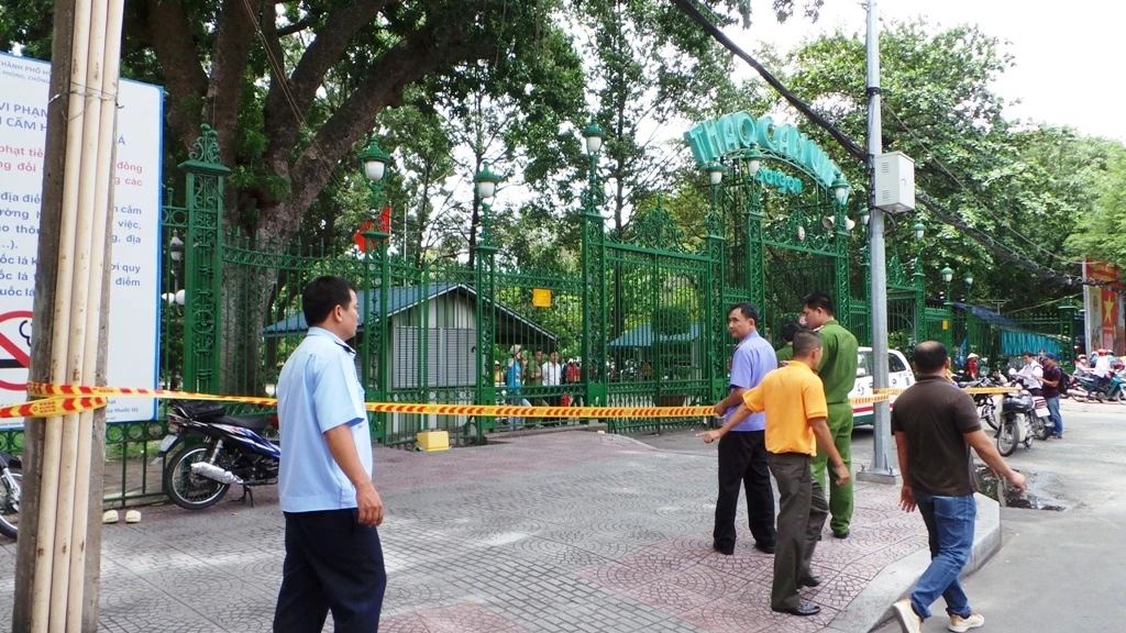 | Hiện trường trước cổng Thảo Cầm Viên Sài Gòn bị phong tỏa phục vụ công tác khám nghiệm hiện trường. |