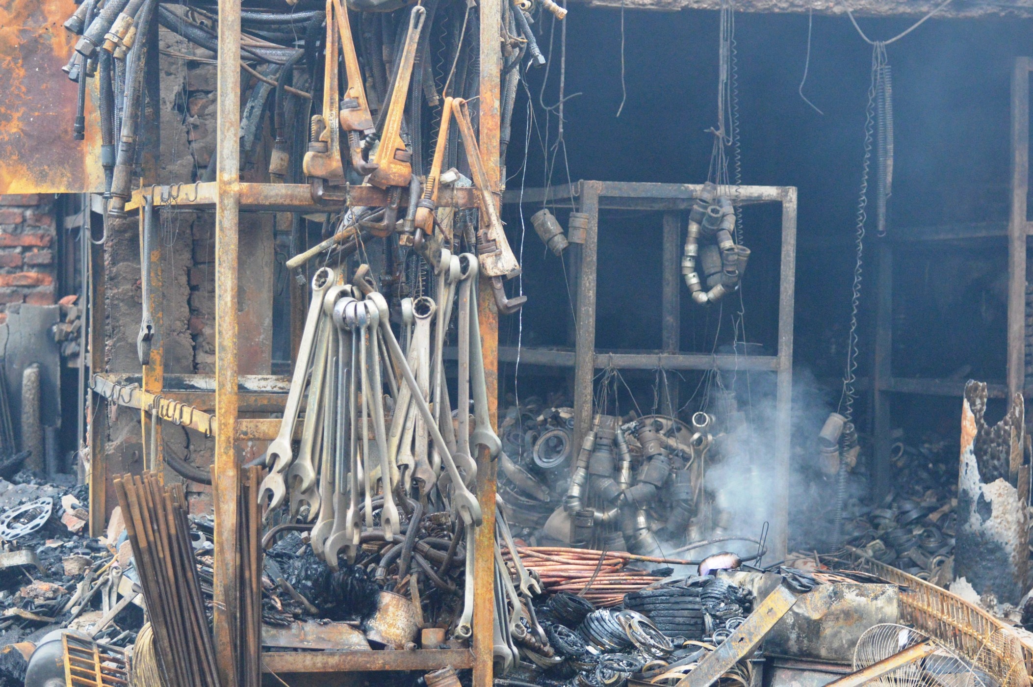 | Hàng hoá bị thiêu rụi, phần tường mái của các ki-ốt cũng bị đổ sập. |