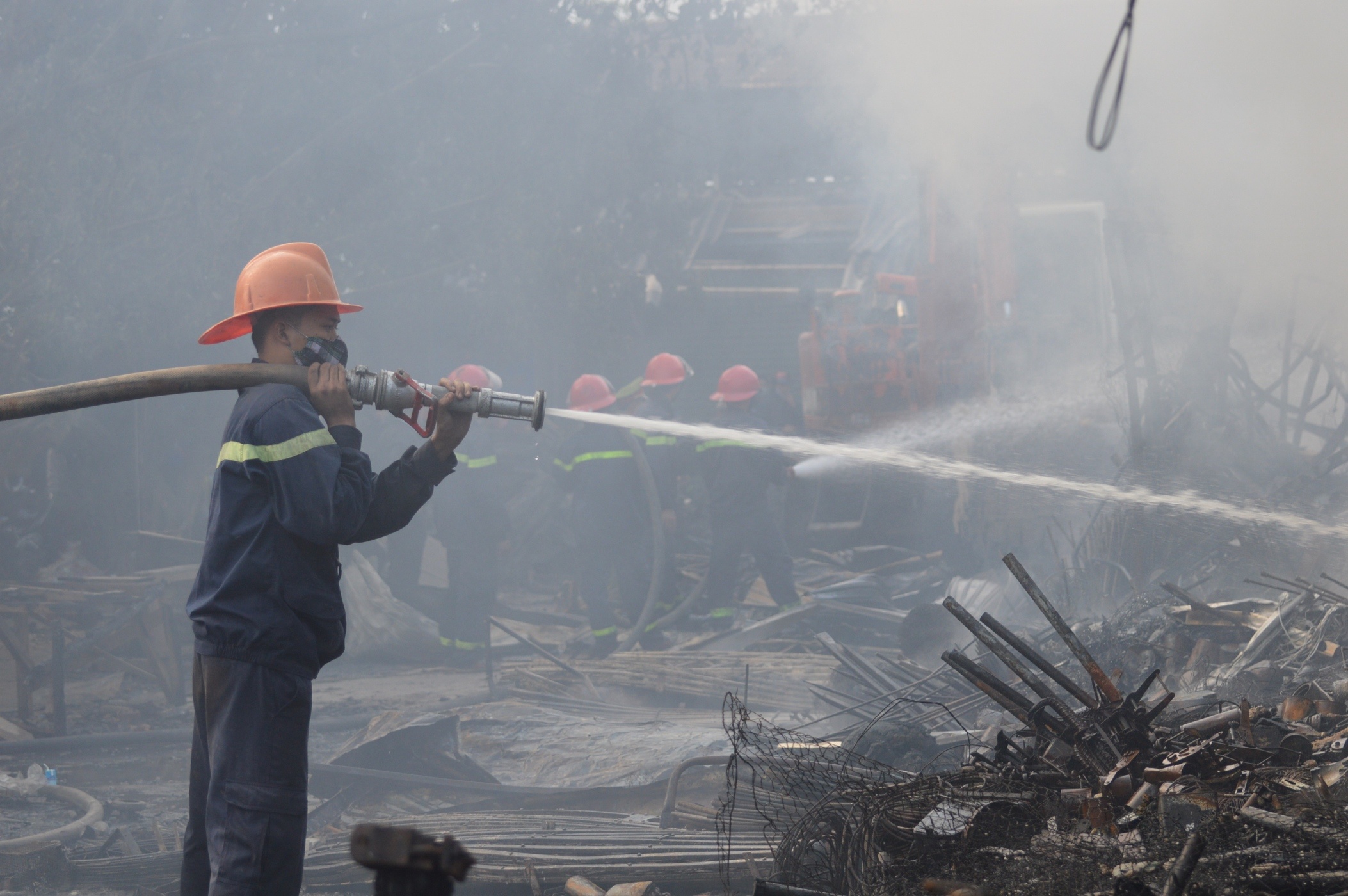 | Vụ cháy xảy ra lúc 2h ngày 2/1. Ngọn lửa bùng lên ở ki-ốt bán lưới ngư cụ của bà Trần Thị Tiền thuộc dãy nhà phụ chợ Ba Đồn (thị xã Ba Đồn, Quảng Bình). Bà Tiền kể, giữa khuya tỉnh giấc sau khi ngửi thấy mùi khét phát ra từ quầy hàng. Bà chạy đến mở quầy kiểm tra thì thấy khói bốc lên nghi ngút nên chỉ kịp chạy vào lấy túi xách đựng tiền và một số giấy tờ trước khi lửa bùng lên. Trong ảnh: Đến 9h ngày 2/1, lực lượng cứu hỏa vẫn còn chữa cháy. |