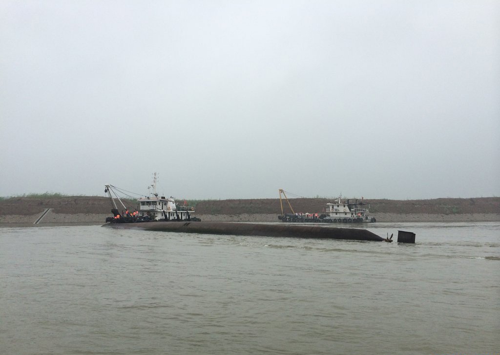 Hình ảnh đầu tiên từ hiện trường tai nạn cho thấy con tàu mang tên Ngôi sao phương Đông lật úp trên sông Dương Tử, phần đáy tàu và chân vịt nổi trên mặt nước sau tai nạn tối 1/6.
