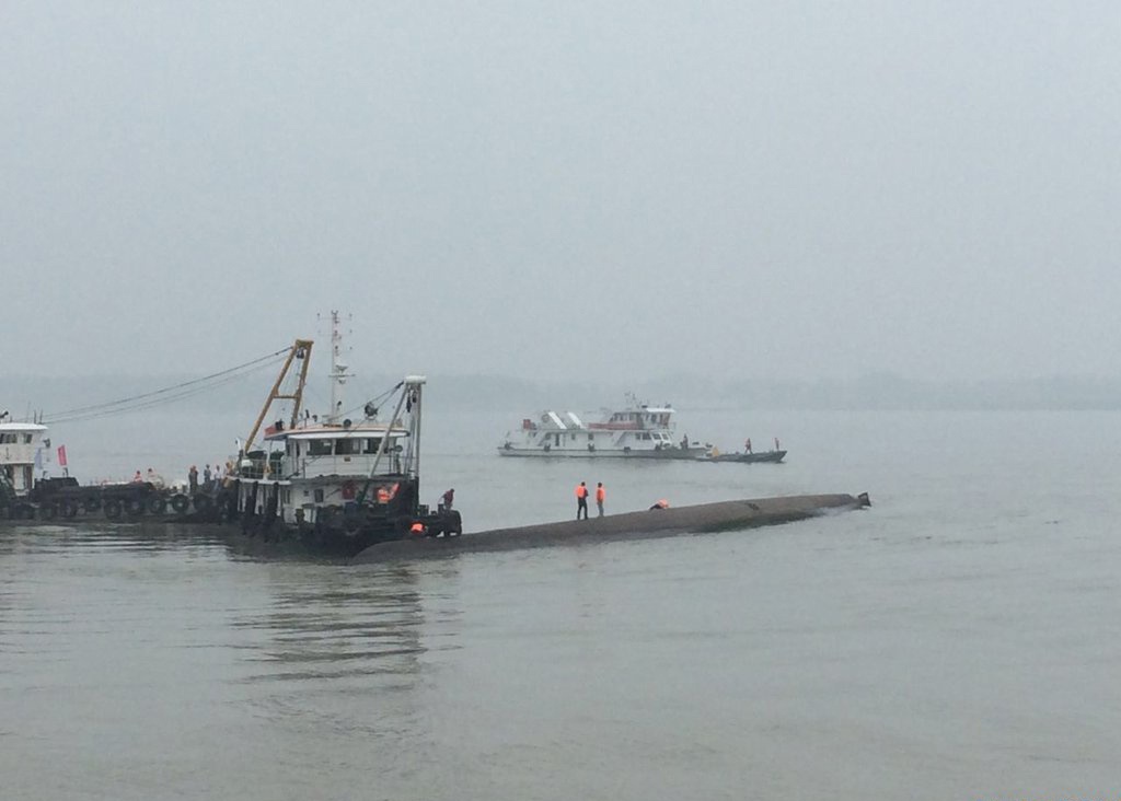 Phần đáy tàu Ngôi sao phương Đông nổi trên mặt nước. Nó lật úp hoàn toàn. Theo Hubei Daily, ít nhất 20 thợ lặn đã được cử tới hiện trường tai nạn. 100 tàu đang tham gia tìm kiếm các nạn nhân. Ảnh: Haiwainet