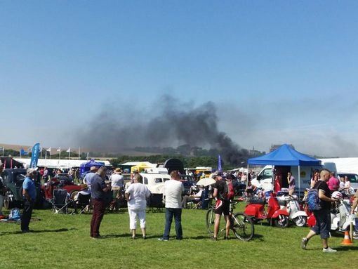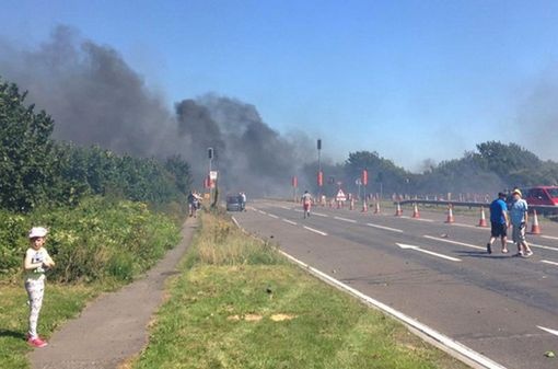 Cột khói lớn bốc lên sau khi phi cơ đâm xuống đường khi đang thực hiện màn nhào lộn trên không trong triển lãm hàng không ở Anh khiến 7 người thiệt mạng hôm 22/8.
