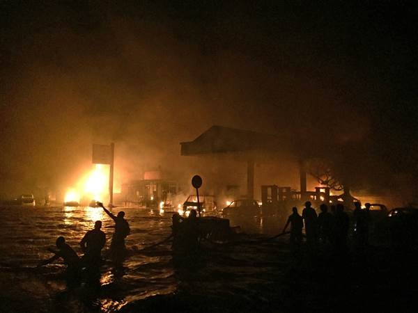 Các nhân chứng cho biết, họ nghe thấy tiếng nổ lớn ở cây xăng, sau đó là tiếng la hét của những người mắt kẹt. Lửa cháy lan từ trạm xăng thiêu rụi mọi thứ xung quanh, bao gồm những chiếc xe đang ngập trong nước đỗ gần đó. Ảnh: AP |