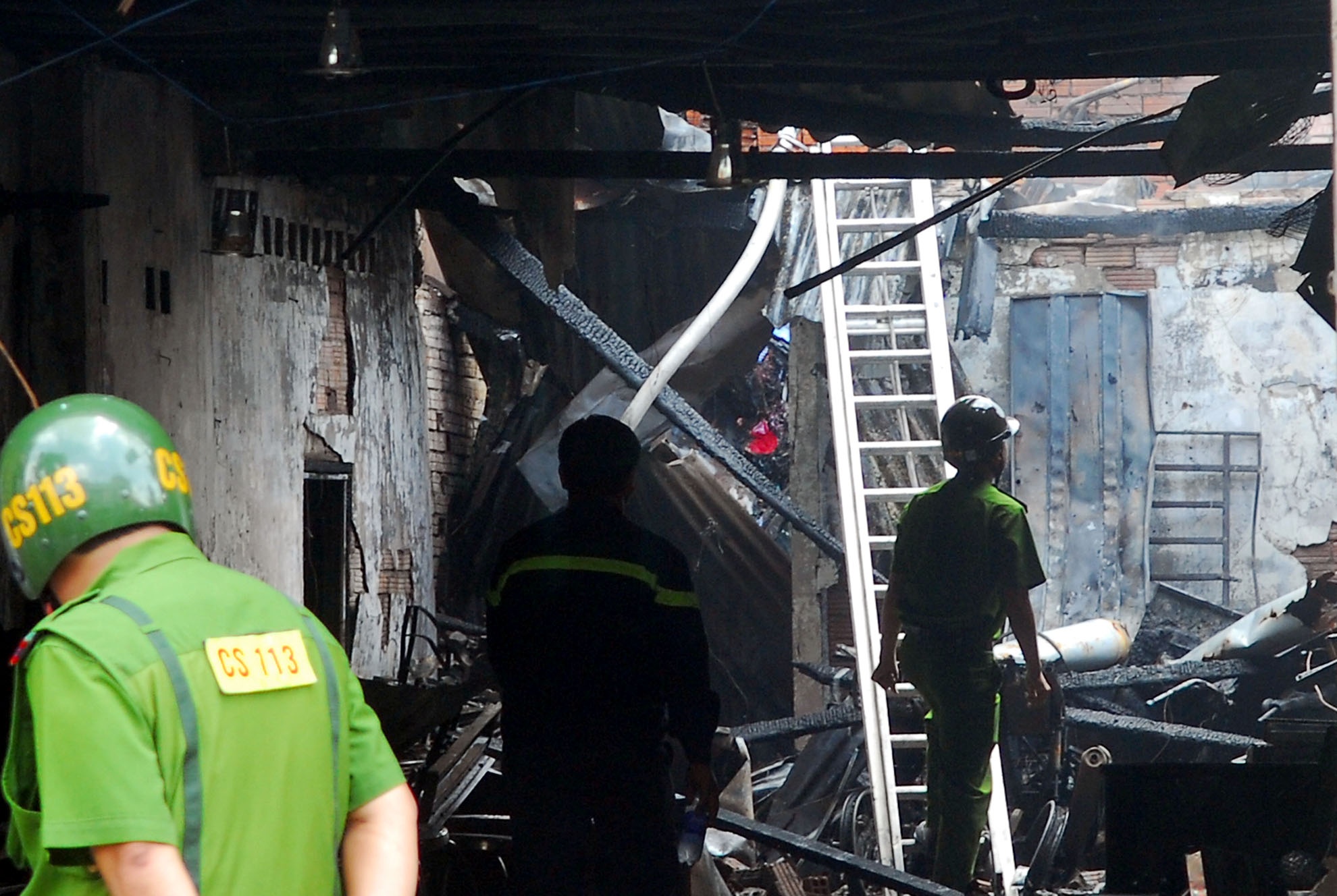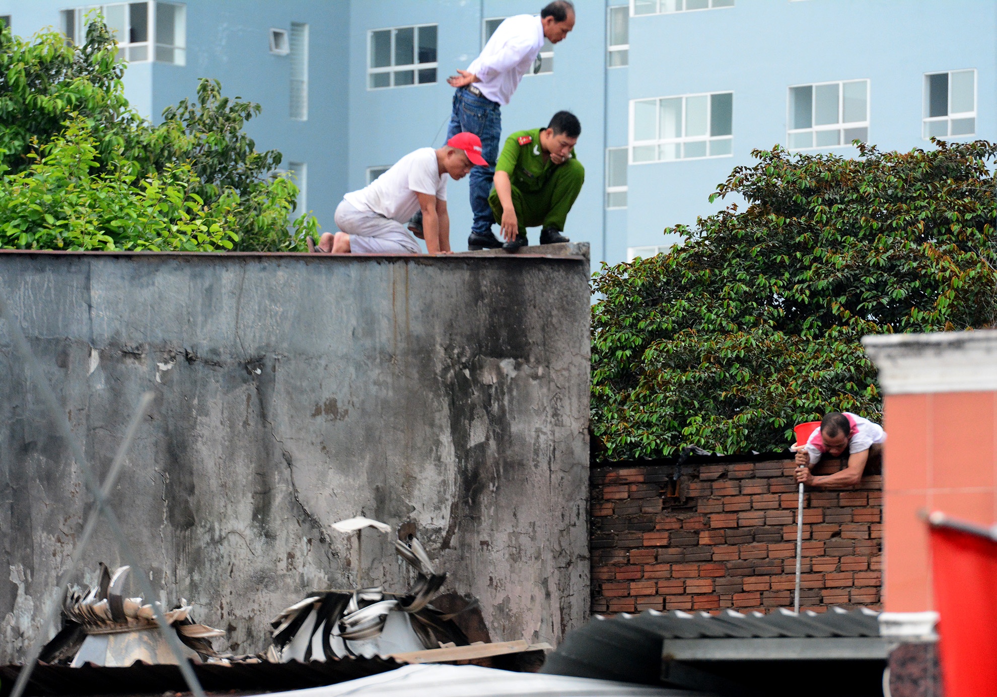 Trên mái nhà bên cạnh, nhân viên cửa hàng xe máy dùng nước dội vào hiện trường.