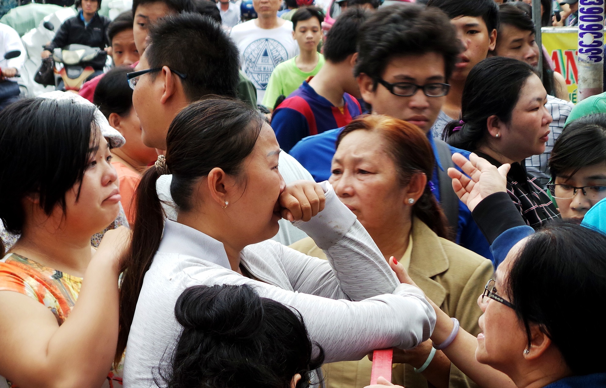 Người thân của 2 nạn nhân mắc kẹt trong đám cháy đứng khóc bên ngoài.
