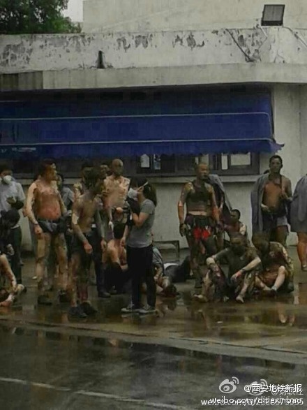 | Những người được cứu thoát đang ngồi chờ ở ngoài xưởng ô tô, nơi xảy ra vụ nổ. Da và tóc họ đều bị cháy. |