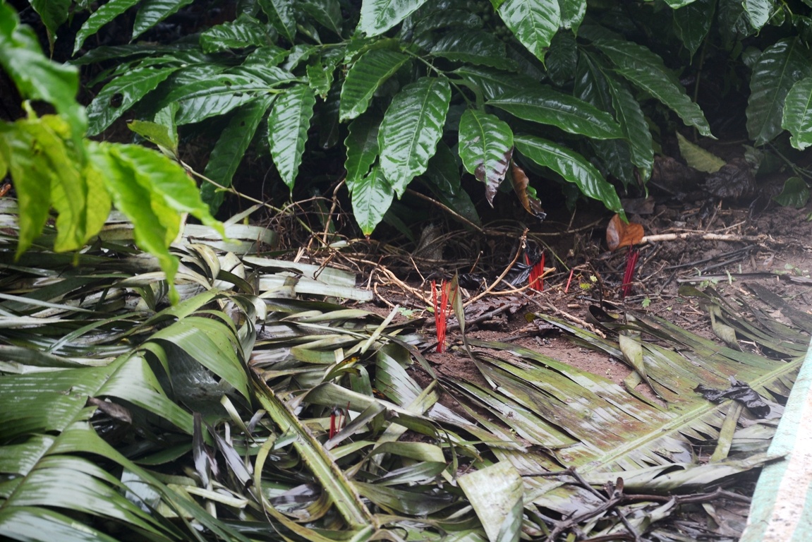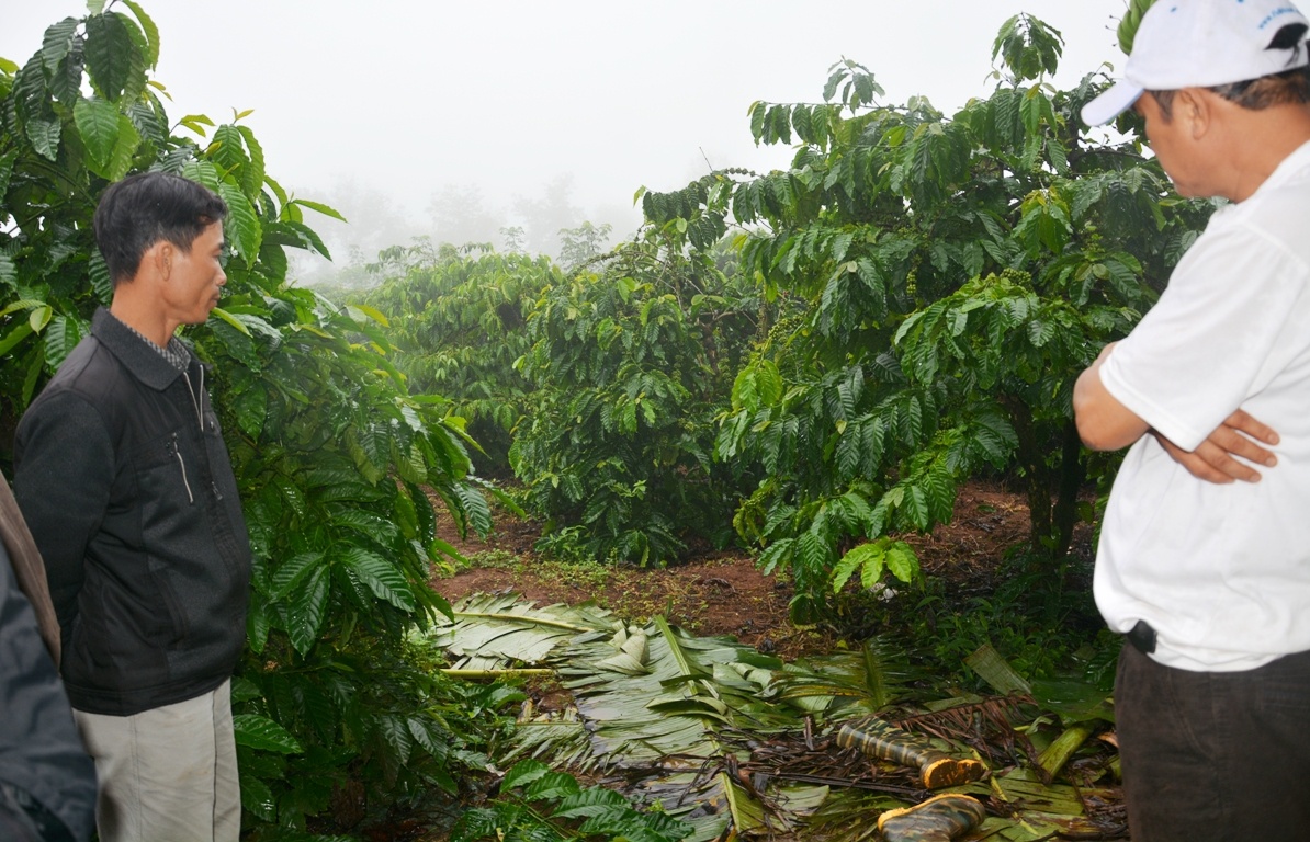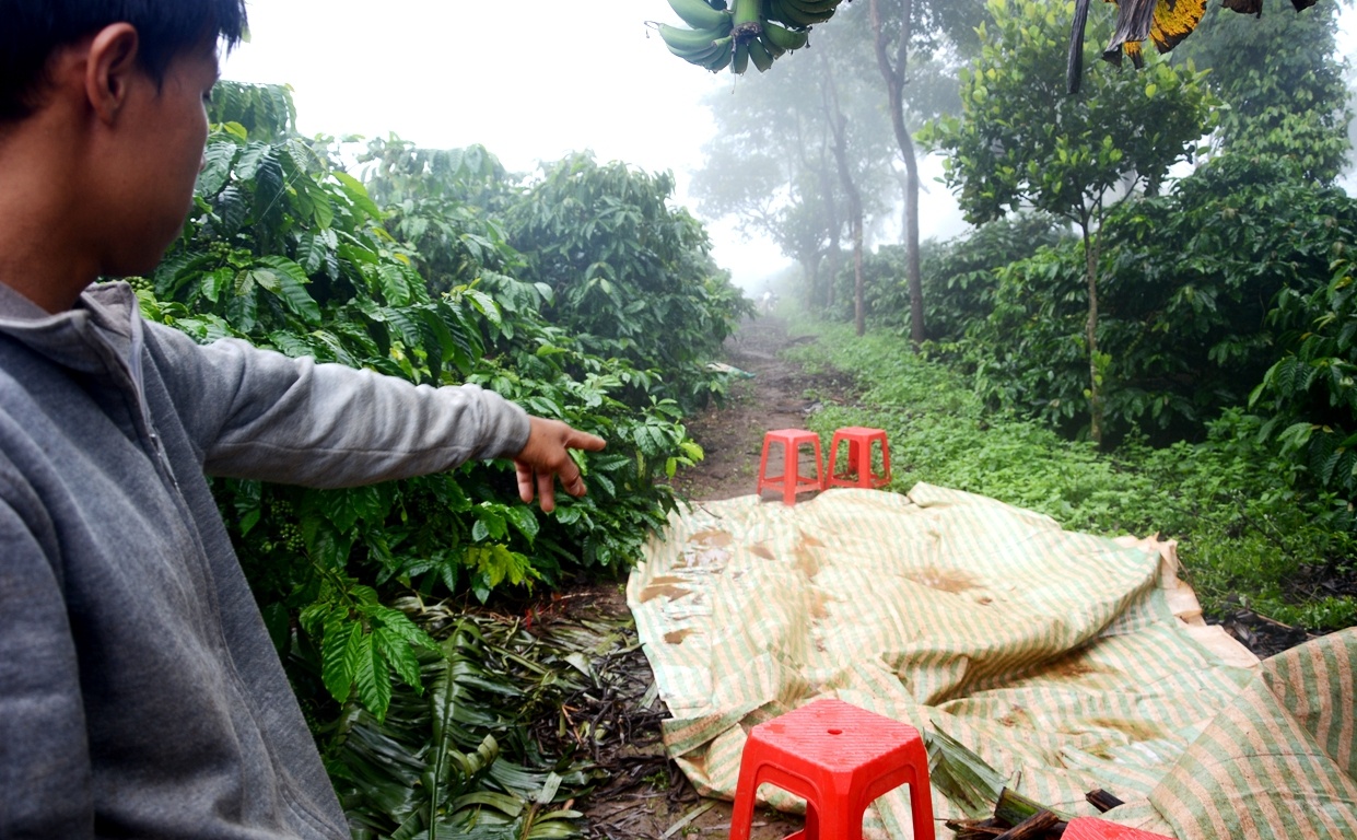 | Khi bị Đản chém nhiều nhát vào đầu và cổ, ông Vấn vội chạy vào rẫy cà phê. Nhưng nghi can vẫn đuổi theo, nạn nhân bị mắc kẹt trong bụi cà phê nên hung thủ tiếp tục chém nhiều nhát nữa khiến ông tử vong tại chỗ. Trên lá cà phê vẫn còn dính nhiều vết máu. |