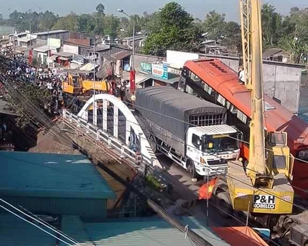 | Hậu quả, xe khách lao thẳng lên thành cầu, khiến hơn 30 hành khách hốt hoảng. Tại hiện trường, chiếc xe tải đã qua gần hết cầu Láng Sen, còn xe khách chổng bánh, một bên nằm trên thành cầu, một bên dựa và hông xe tải. Ảnh: Người lao động. |