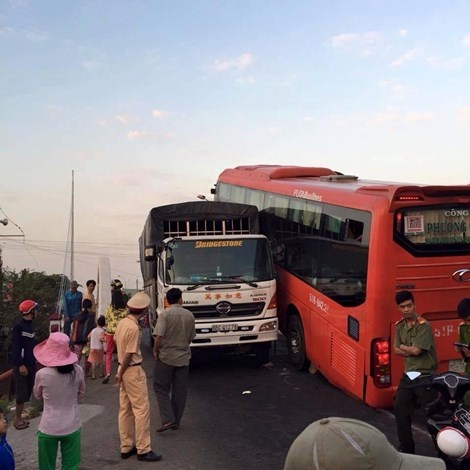 | Khi xe tải chuẩn bị qua hết cầu Láng Sen thì xảy ra va chạm với ôtô khách của hãng Phương Trang BKS 51B do tài xế Nguyễn Thiện Trung (34 tuổi, ngụ tỉnh Kiên Giang) điều khiển lưu thông chiều ngược lại. Ảnh: Vietnamnet. |