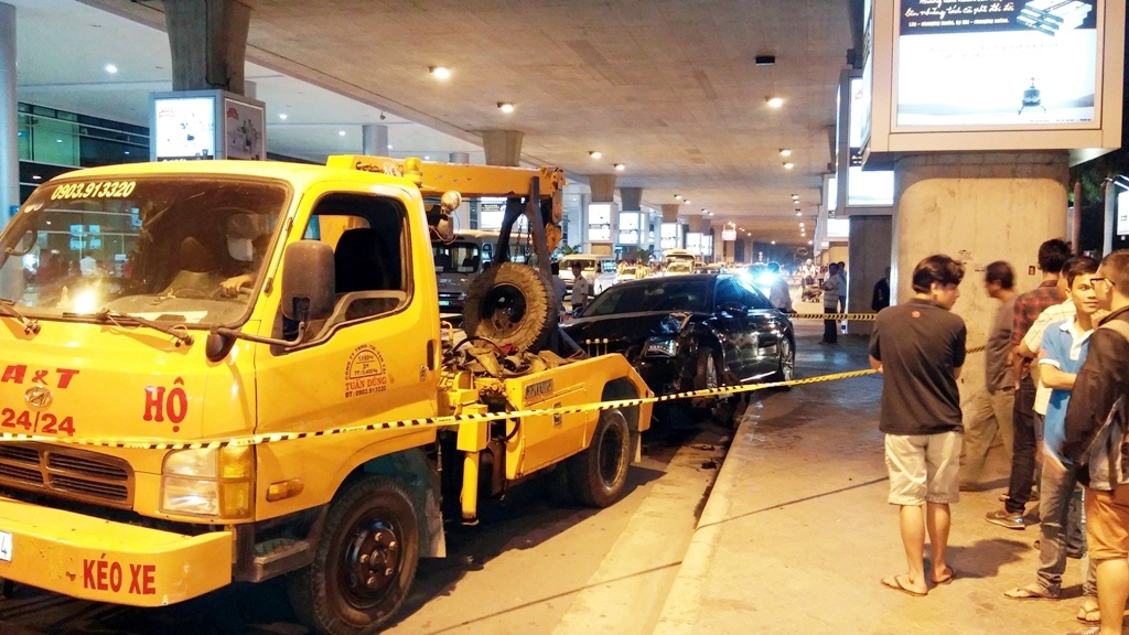 | Ngay sau khi vụ việc xảy ra, lực lượng an ninh sân bay nhanh chóng phong tỏa hiện trường, tài xế Tân cũng được tạm giữ chờ công an đến giải quyết. Bước đầu, Tân thừa nhận quên cài thắng tay, đạp nhầm chân ga dẫn đến vụ tai nạn. Anh này là cháu Hồ Ngọc Hà, mới lái chiếc xe sang này được 1 tháng. |