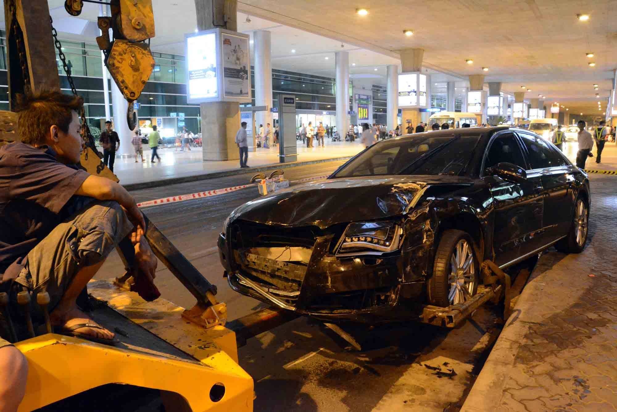 | Chiếc Audi A8 bị hư hỏng nặng phần đầu, 2 xe bị tông trúng cũng bị hỏng phần đuôi. Giá thị trường khi dòng xe Audi A8 ra mắt tại Việt Nam từ 4,4 tỷ đến hơn 5 tỷ đồng tùy theo phiên bản. Thời điểm xảy ra vụ việc, nữ ca sĩ nổi tiếng cùng chồng là doanh nhân Quốc Cường có mặt tại khu vực ga hành khách quốc tế của sân bay Tân Sơn Nhất. |