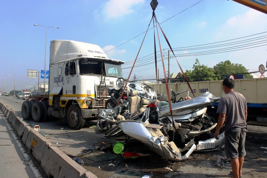 | Cú tông cực mạnh của xe đầu kéo khiến ôtô du lịch biến dạng hoàn toàn. Bốn người tử vong tại hiện trường, thi thể kẹt bên trong. Một người được đưa đi cấp cứu nhưng không qua khỏi. |