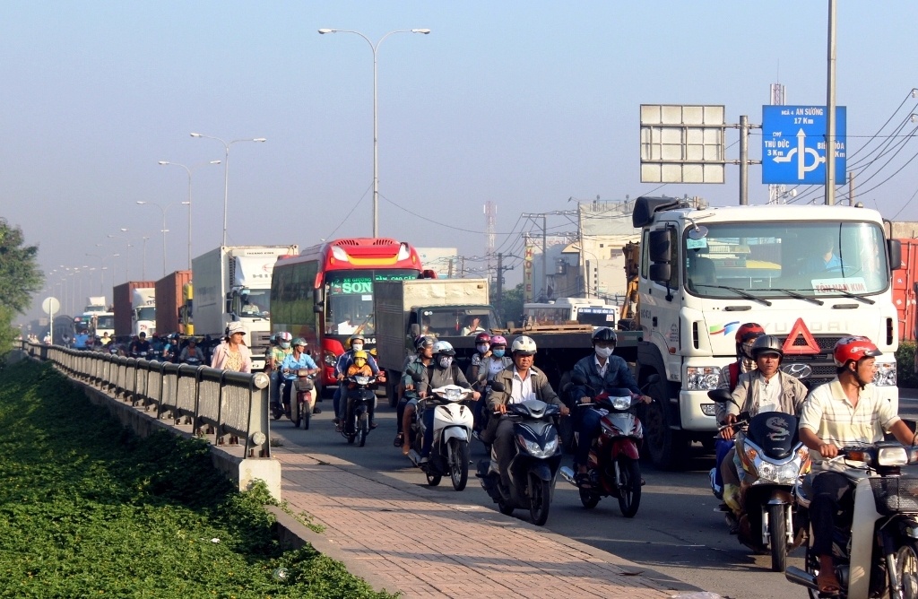 | Giao thông trên quốc lộ 1A qua đoạn khu chế xuất Linh Trung bị ùn tắc nghiêm trọng. |