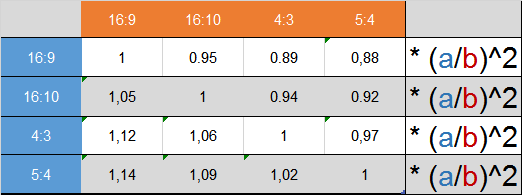 Dựa theo bảng trên, tỷ lệ diện tích hiển thị giữa thiết bị có tỷ lệ màn hình ở hàng ngang (màu xanh) và đường chéo màn hình là a và thiết bị có tỷ lệ màn hình ở cột dọc (màu đỏ) và đường chéo màn hình là b sẽ bằng hằng số ở ô tương ứng nhân với (a/b)^2.