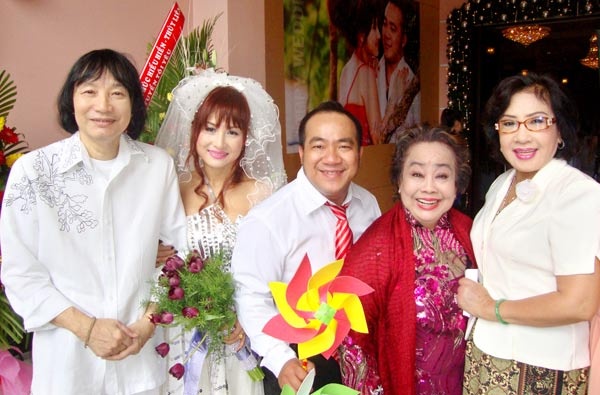 Nụ cười rạng rỡ của mẹ Hiếu Hiền - nghệ sĩ Kim Ngọc khi nghệ sĩ cải lương Minh Vương và Lệ Thủy tới mừng hạnh phúc của hai con mình.