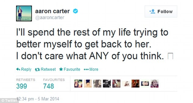 Các fan càng tin Aaron Carter muốn nối lại tình xưa với Hillary khi những dòng chia sẻ đầy mặn nồng tiếp tục xuất hiện trên trang cá nhân của anh: "Tôi sẽ dành phần còn lại của cuộc đời để cố gắng hoàn thiện bản thân tốt hơn để có thể trở lại với cô ấy. Tôi không quan tâm tới bất kỳ điều gì các bạn nghĩ".