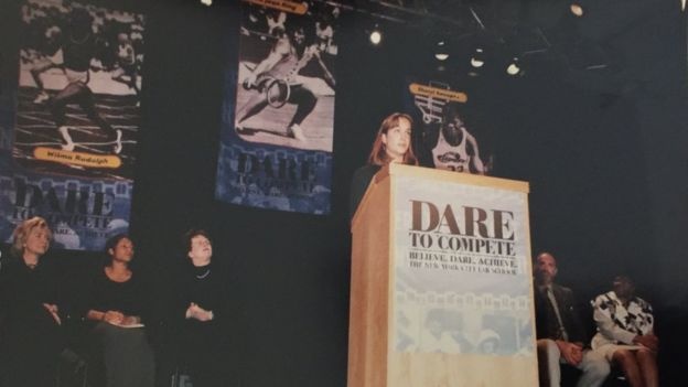 | Đệ nhất phu nhân Mỹ Hillary Clinton (ngoài cùng bên trái) nghe nữ sinh Sofia Totti phát biểu trong sự kiện quảng bá phim tài liệu Dare to Compete năm 1999. Ảnh: BBC |