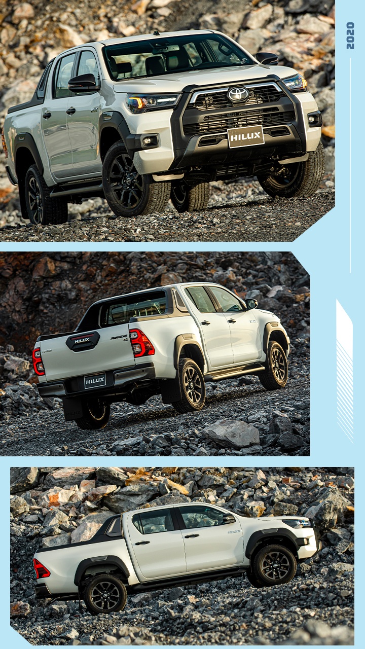 Phiên bản nâng cấp mới nhất của Hilux mang thiết kế hầm hố hơn. Trên phiên bản cao nhất Adventure, Hilux được trang bị hệ thống đèn pha công nghệ bi-LED, bộ mâm 18 inch hình cánh hoa, đèn hậu LED đồ họa chữ B cùng các chi tiết ốp nhựa đen mờ như cản trước, vòm bánh xe mang đến vẻ hầm hố cho chiếc bán tải.
