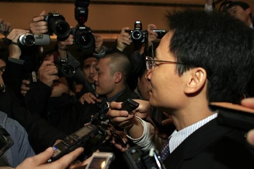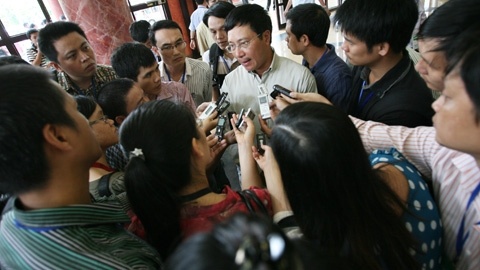 | Bộ trưởng Vũ Đức Đam trong vòng vây báo chí. |