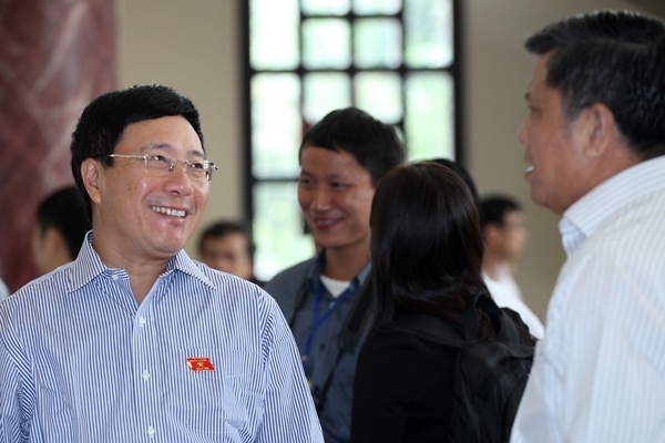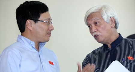 Bộ trưởng Phạm Bình Minh trao đổi với đại biểu Quốc hội Dương Trung Quốc.