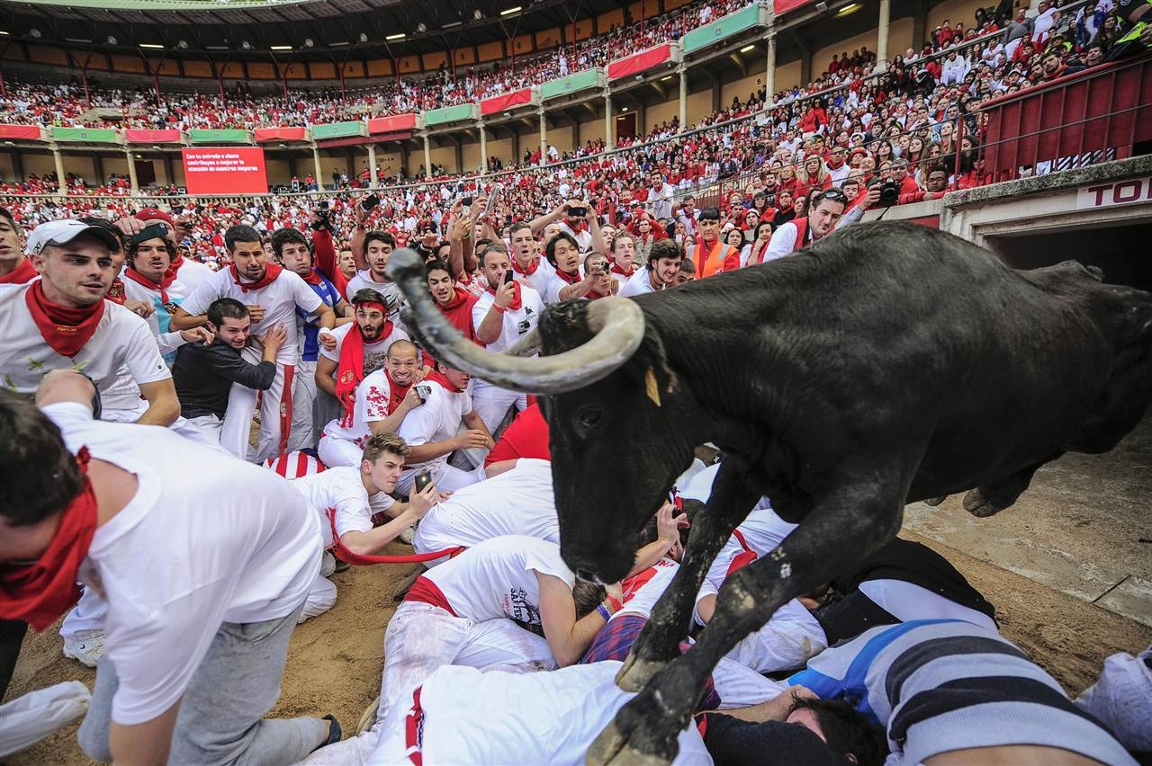 Bò tót lao qua nhiều người trong lễ hội San Fermin ở Pamplona, Tây Ban Nha hôm 8/7. Lễ hội kéo dài một tuần, thu hút rất đông khách du lịch và những người ưa mạo hiểm. Những người tham dự lễ hội chạy phía trước những con bò trong một tuyến phố hẹp dẫn tới trường đấu. Ảnh: AP |