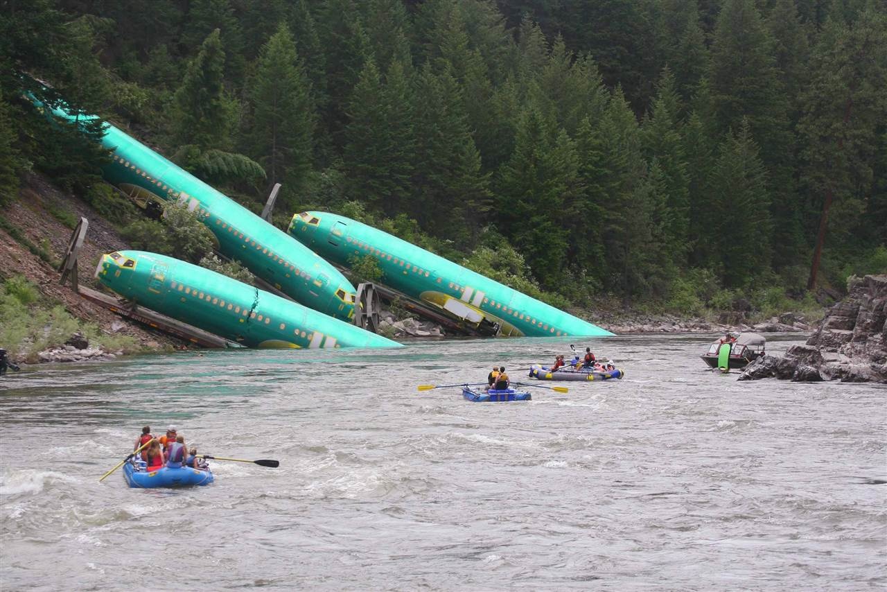 Phần thân ba chiếc Boeing 737 rơi xuống con sông Clark Fork ở Montana, Mỹ sau khi đoàn tàu chở chúng văng ra khỏi đường ray hôm 4/7 trong lúc di chuyển từ nhà máy ở Spirit Aerosystems tới bang Washington. Ảnh: Reuters |