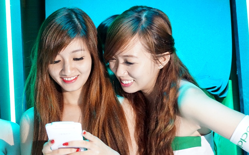 | Hai PG xinh đẹp cũng say sưa với chiếc smartphone mới. |
