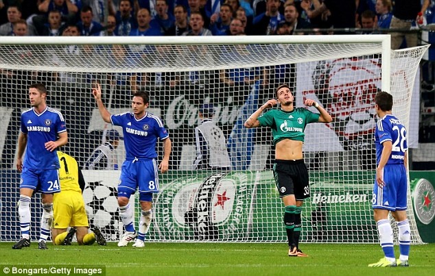 | Roman Neustadter (Schalke) tiếc nuối khi dứt điểm bằng đầu đưa bóng đi vọt xà ngang. |