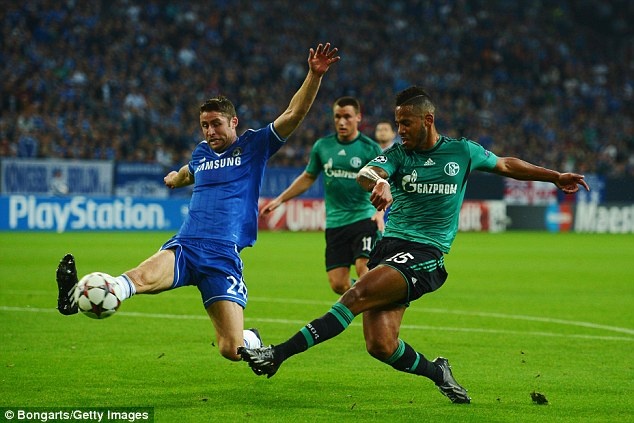 | Gary Cahill nỗ lực ngăn cản Dennis Aogo chuyền bóng. |
