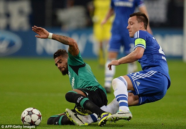 | Thủ quân John Terry hoàn thành tốt nhiệm vụ khóa chặt Kevin-Prince Boateng. |