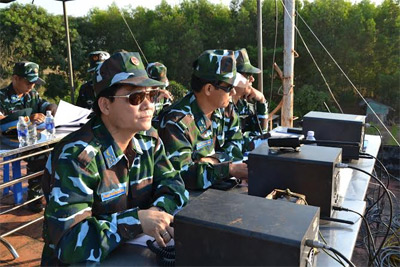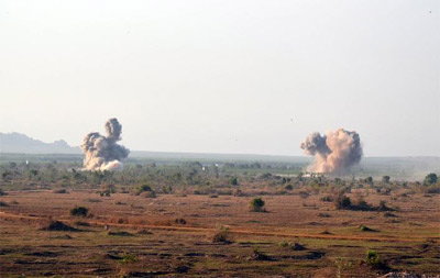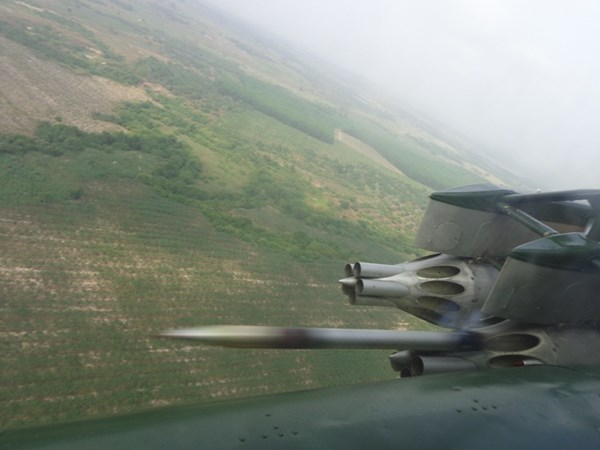 | Để tham gia cuộc diễn tập lần này, tiêm kích đa năng Su-30MK2 (cất cánh từ sân bay Biên Hòa, Đồng Nai), tiêm kích bom Su-22M4 (bay vào từ sân bay Thành Sơn (Phan Rang, Ninh Thuận), trực thăng chiến đấu Mi 8 và UH 1A. Các máy bay diễn tập ném bom, phóng rốc két vào các mục tiêu giả định trên mặt đất. Ảnh: Biên đội cường kích Su-22M4 vừa khai hỏa mục tiêu. |