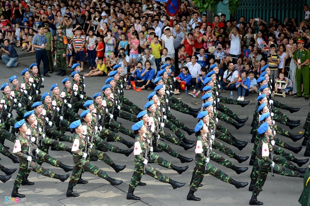 Hình ảnh cô gái dẫn đầu khối trường quân y được dân mạng chia sẻ nhiều. Theo tìm hiểu, cô gái tên là Trúc Quỳnh sinh năm 1993, quê Sơn Tây, Hà Nội. Cô chia sẻ, khi đi qua lăng Bác chứng kiến ánh mắt hạnh phúc của người dân hai bên đường, Quỳnh và các đồng đội như được tiếp thêm sức mạnh, cố gắng hoàn thành xuất sắc nhiệm vụ được giao. Ảnh: VTV