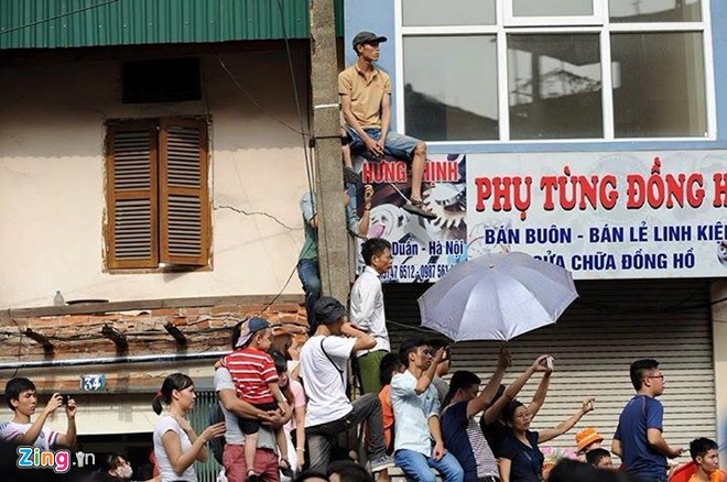 Để tận mắt chứng kiến lễ diễu binh chào mừng Quốc Khánh 2/9, rất nhiều người dân đã bất chấp nguy hiểm trèo cột điện, ngồi trên nóc ôtô, tủ điện...để tiện theo dõi nghi lễ. Ảnh: Hiếu Trần