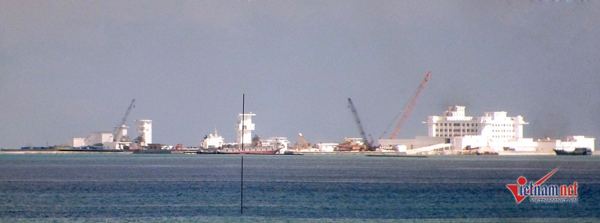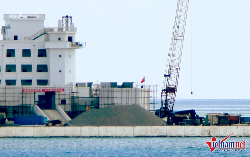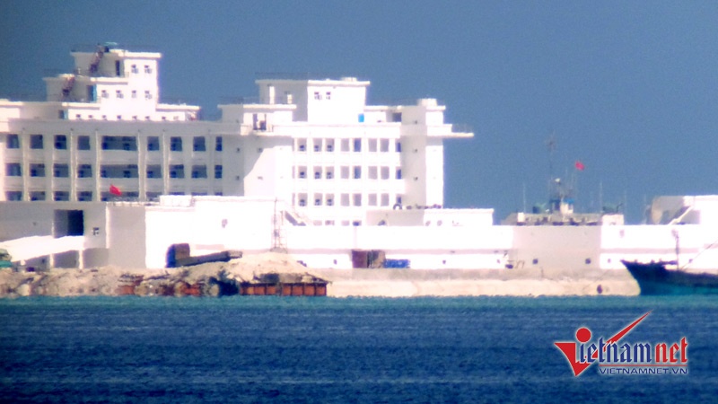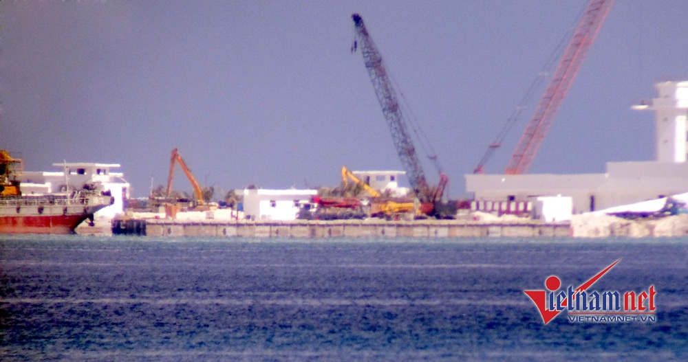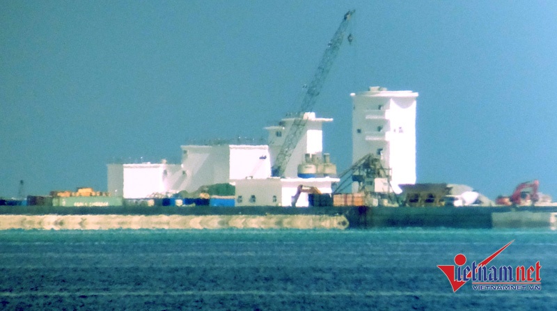 | Toàn cảnh các công trình xây dựng trái phép của TQ trên đảo Gạc Ma, bao gồm tòa nhà trung tâm cao 6 tầng, các tháp quan sát không lưu cùng các hệ thống cần cẩu, tầu vận tải hoạt động liên tục. |