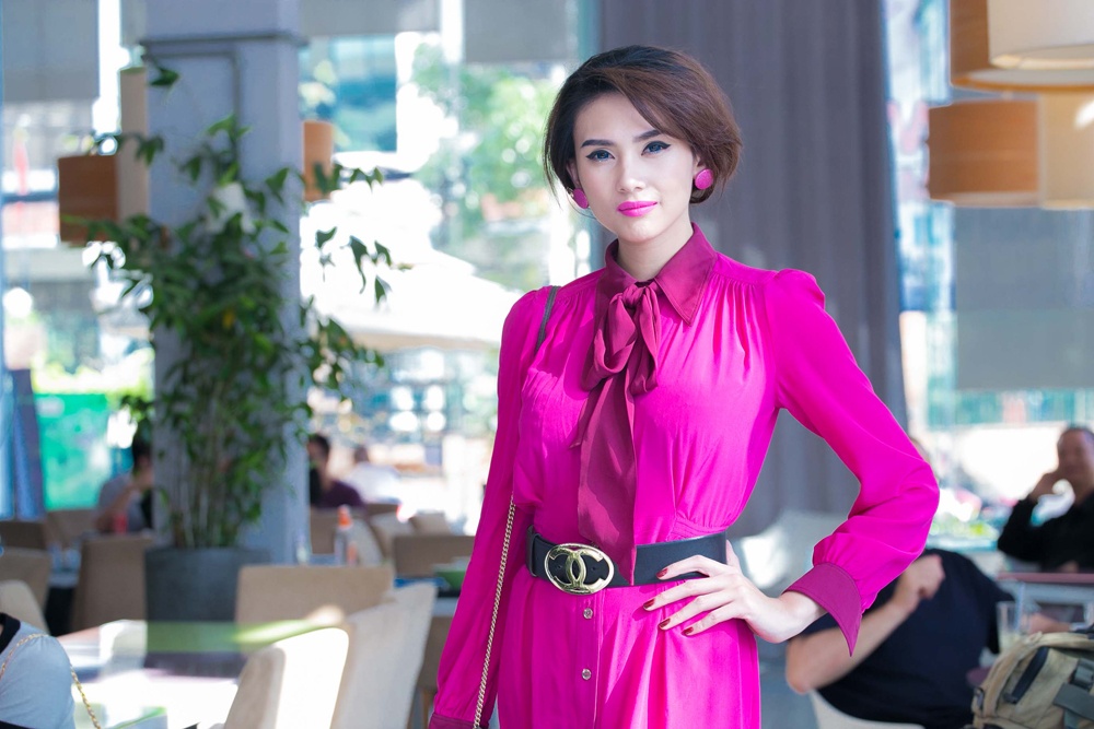 Nữ người mẫu ăn mặc kín đáo, trang điểm theo tông trang phục khi đến chúc mừng người bạn thân phát hành sản phẩm âm nhạc đầu tiên. Đây cũng là lần hiếm hoi chân dài dự buổi họp báo ra mắt một sản phẩm âm nhạc của bạn bè.