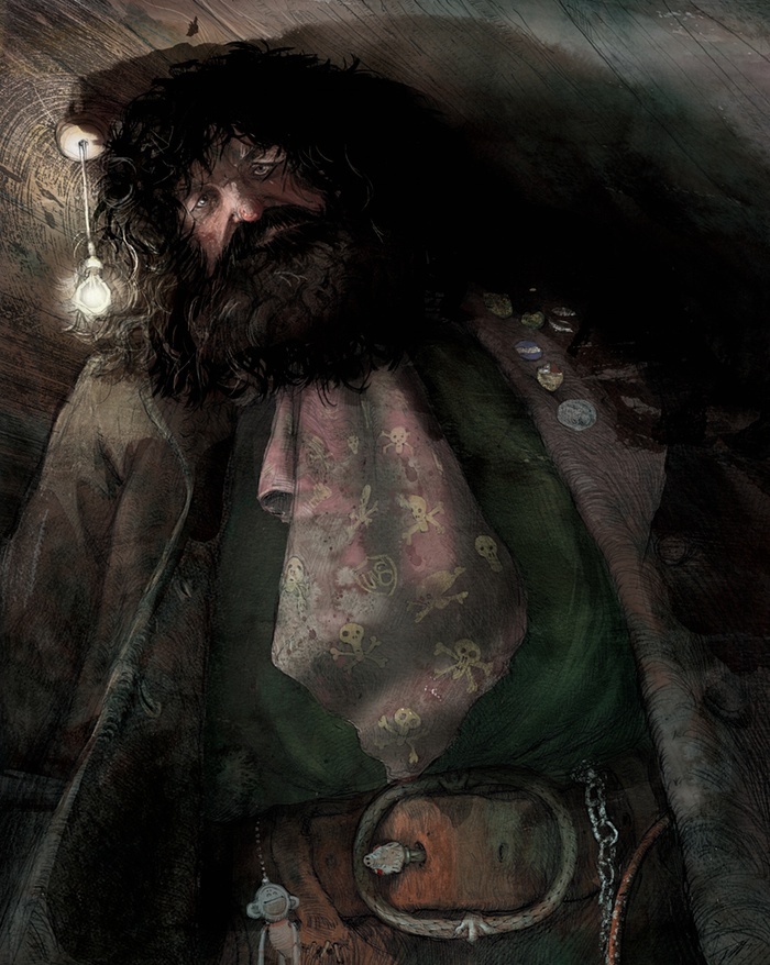 | Dáng vẻ khổng lồ của bác Hagrid được Jim Kay thể hiện bằng rất nhiều kỹ thuật phức tạp từ màu chì, màu nước, màu sáp, sơn dầu cho tới acrylic. |
