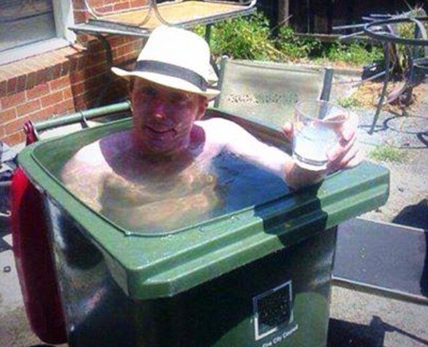 Nhằm tránh nóng, một người dân biến thùng rác thành bồn tắm.