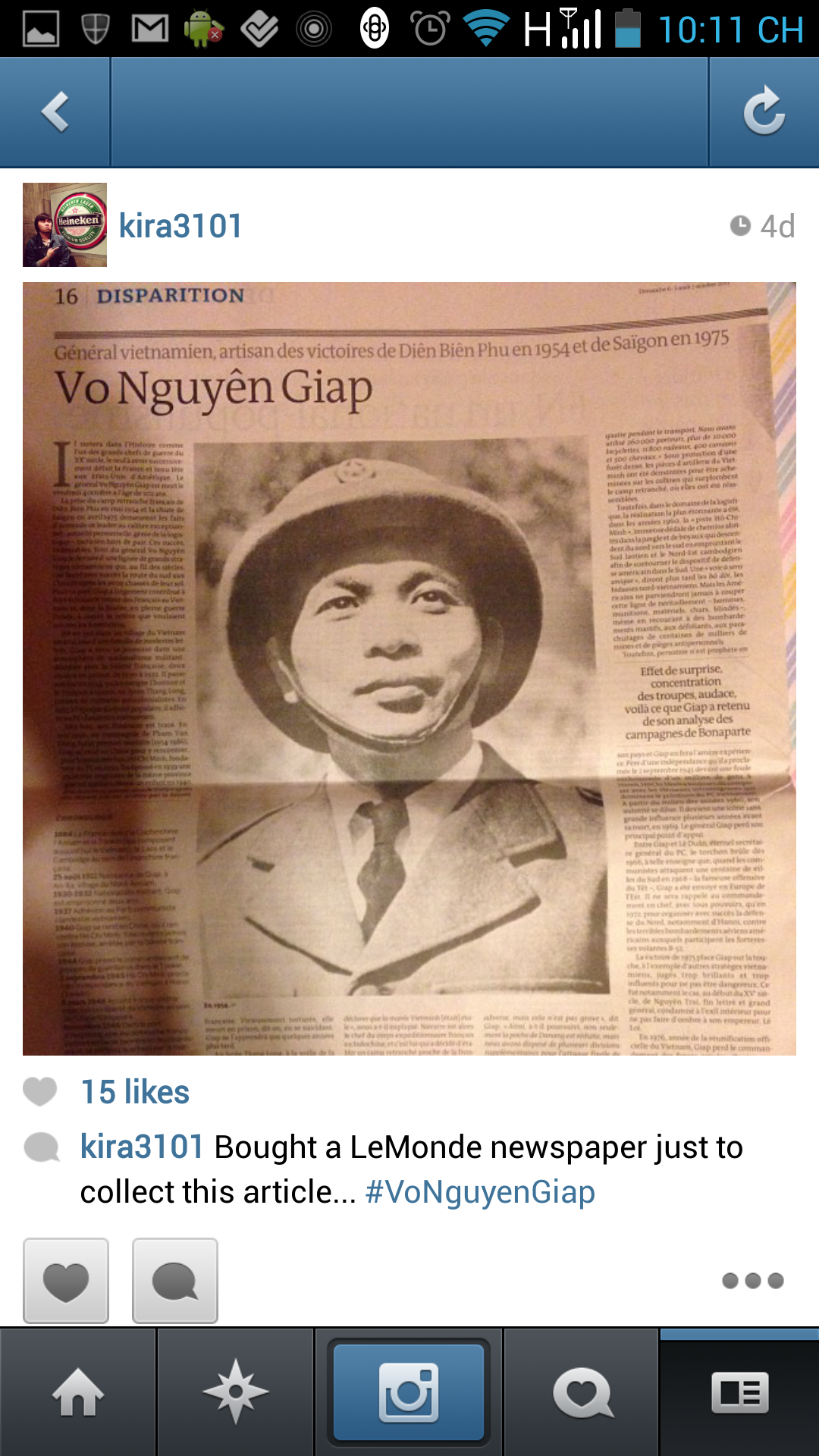 | Một người Việt ở hải ngoại chia sẻ ảnh chụp lại một bài báo nước ngoài nói về sự ra đi của tướng Giáp. |