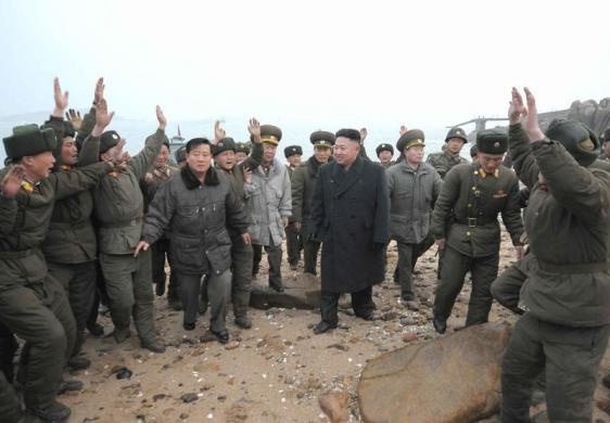 Nhà lãnh đạo họ Kim trong lần thăm đảo Wolnae ngày 11/3. Sau vụ thử hạt nhân hôm 12/2, Jong Un thường xuyên thị sát quân đội và còn trực tiếp chỉ huy tập trận bắn đạn thật. Ảnh: Reuters/KCNA.