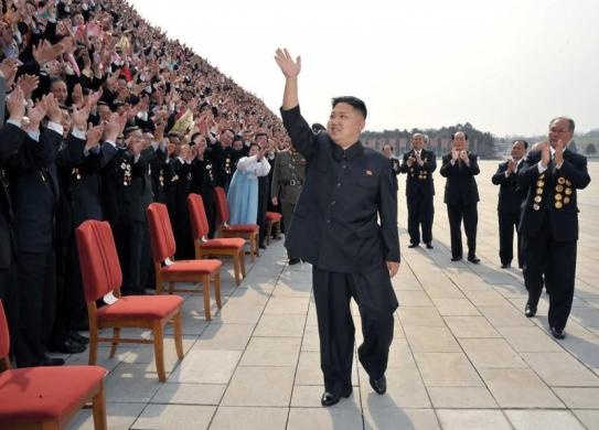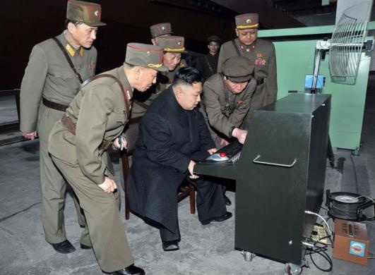 Nhà lãnh đạo trẻ trò chuyện với các sĩ quan tại Trung tâm chỉ huy và điều khiển vệ tinh trước khi Triều Tiên cho phóng tên lửa Unha-3. Tên lửa Unha-3 của Triều Tiên được phóng thành công lúc 9h49 ngày 12/12/2012 và sau đó đưa vệ tinh Kwangmyongsong-3 vào quỹ đạo. Ảnh: Reuters/KCNA.