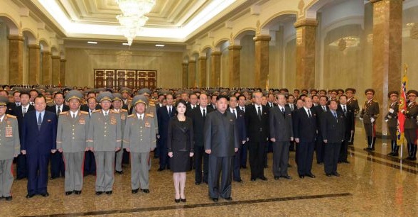 Nhà lãnh đạo Triều Tiên cùng phu nhân Ri Sol Ju tham dự lễ tưởng niệm hai năm ngày mất của cố lãnh đạo Kim Jong Il tại Cung tưởng niệm Kumsusan ngày 17/12. Trong buổi lễ này, bà Kim Kyong-hui, em gái của cố lãnh đạo Kim Jong Il và là vợ của ông Jang Soang Theak, người mà Bình Nhưỡng vừa xử tử, không xuất hiện. Ảnh: AP.