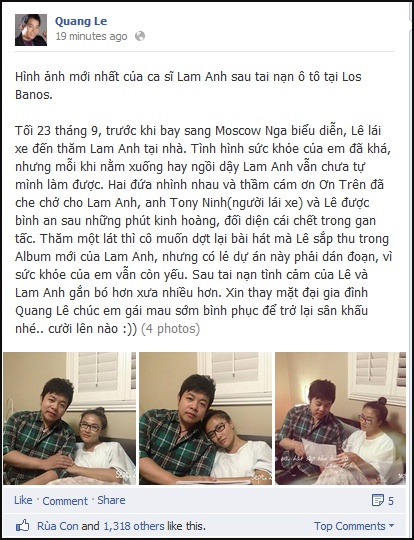 Trên trang cá nhân của mình, Quang Lê vừa cập nhật những hình ảnh mới nhất của nữ ca sĩ hải ngoại Lam Anh sau vụ tai nạn kinh hoàng trên đường cao tốc từ San Jose về Long Beach (Mỹ). Theo chia sẻ của giọng ca gốc Huế thì tối 23/9 vừa rồi, trước khi lên đường sang Nga biểu diễn, anh đã đích thân lái xe tới thăm cô bạn đồng nghiệp đang nằm điều trị tại nhà riêng.