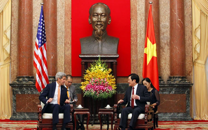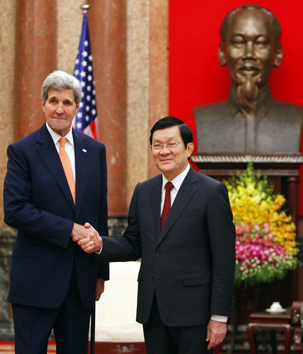 | Đón chào Ngoại trưởng Mỹ trở lại Việt Nam, Chủ tịch nước Trương Tấn Sang cám ơn ông Kerry vì những nỗ lực góp phần bình thường hóa và phát triển quan hệ hai nước từ khi ông làm thượng nghị sĩ. |