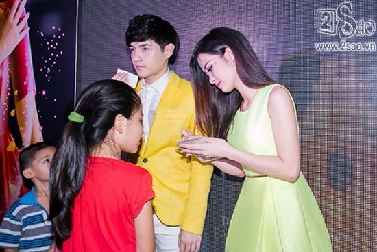 | Trong buổi họp fan, một bé trai cầm giấy tận tình thấm mồ hôi cho Nhật Thủy. Nữ ca sĩ cũng song ca với một bé gái. |