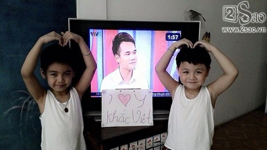 | Mặc dù chỉ thấy Khắc Việt trên vô tuyến nhưng hai cậu bé đã “cuồng” như thế này. |