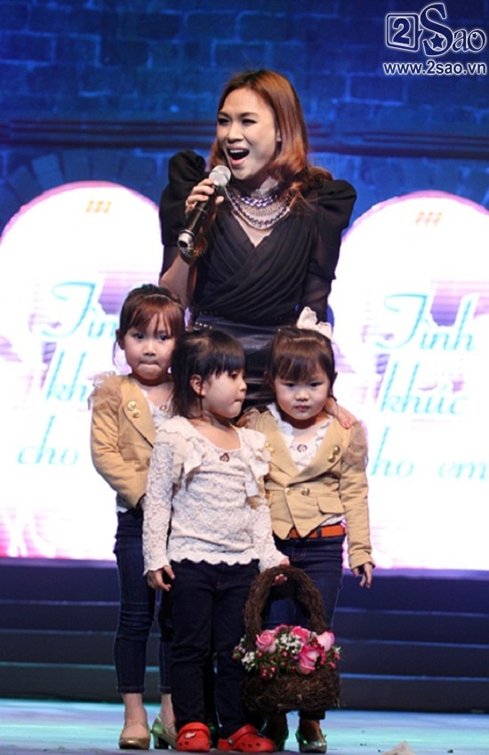 | Mỹ Tâm sung sướng khi được 3 hot girl nhí lên sân khấu tặng hoa. |