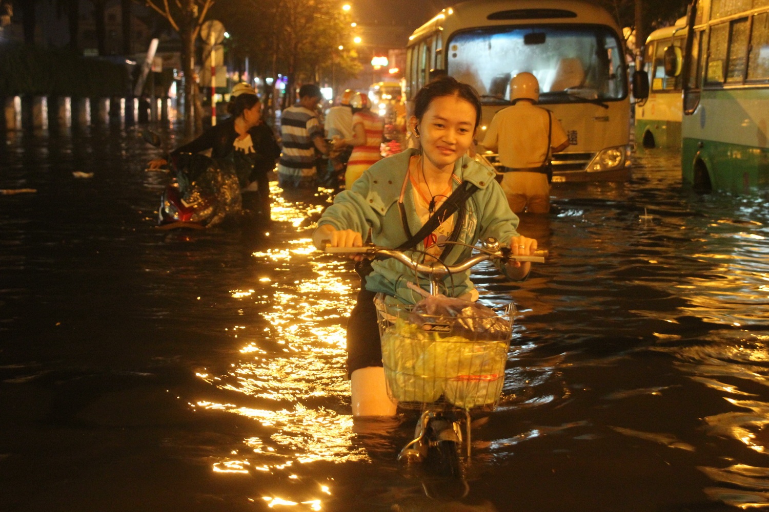 Vất vả, bì bõm dắt xe qua "phố sông" nhưng người Sài Gòn vẫn nở những nụ cười tươi khi phóng viên chụp ảnh.