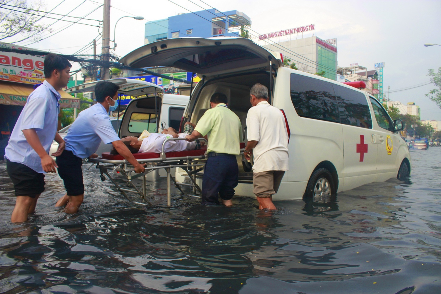 Xe cấp cứu chết máy giữa dòng nước, bệnh nhận được chuyển sang xe khác ngay giữa biển nước.